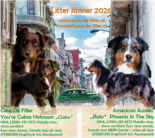 Diese Verpaarung führt all die Aussielinien zusammen, die uns seit 30 Jahren Aussiezucht begleiten. Puk (Springfever, Touchstone, Mistretta...) ist ein perfekter Allrounder. Die Teamprüfungen bis BgH3 absolvierte er mit seinem Frauli Jeannette genauso brav wie seine Trainings in Agility und beim Schafe hüten. Loona (Diamond Aire, Touchstone, Mistretta) engagiert sich sehr bei allen sportlichen Aktivtäten. Besonders gerne läuft sie mit am E-bike und liebt das Schwimmern heiß. Das Hüten an den Schafen macht viel Spaß mit ihr, da sie dabei Ruhe und Besonnenheit zeigt.
